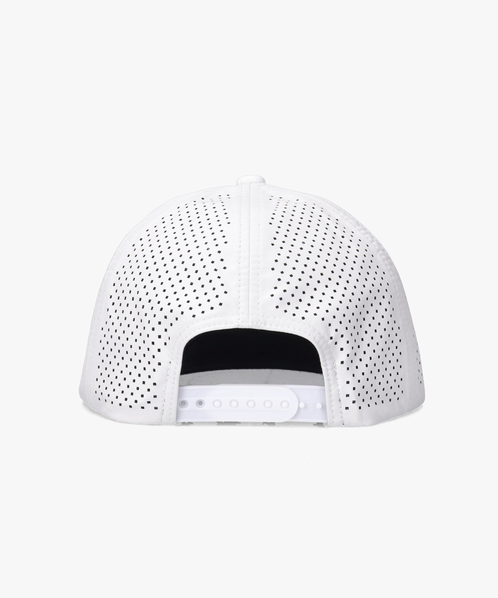 撥水加工を施したストレッチタフタ生地で一部に再生原料を使用。光沢がないマットな質感で肌馴染みがよい色合いが特徴の6パネルキャップです。横と後のパネルは、オリジナルパターンの穴加工により通気性に優れ、内側はメッシュ生地で肌離れが良い仕様。額の汗が付着しやすい前パネル裏は、抗菌防臭加工を施したクッション性のあるメッシュ生地を使用しています。内側の汗止め帯は、速乾性に優れ抗菌防臭加工を施した綿タッチのニット素材です。クラウンは、深めで安定感のある被り心地。ツバは、長時間被っても疲れにくいソフトなフラットタイプ。強い日射しから眩しさを軽減するため、ツバ裏を黒色にしています。頭囲のサイズ調整が簡単にできるスナップバックアジャスター仕様。ラバー素材のロゴワッペンが付属します。炎天下での長時間の着用を考慮した仕様であるため、ゴルフ用としてもおすすめです。