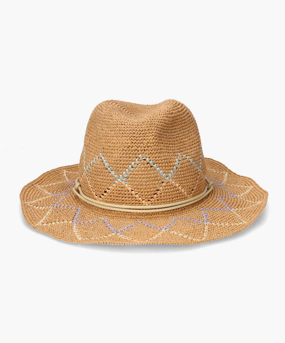 ペーパーヤーンを使用した中折れハットです。手編みで優しい風合いに仕上げているので、かっちりとし過ぎずラフに被れます。BLACKはシックにまとめ、BEIGEは今シーズンのテーマカラーで色づけました。細かく編まれたジグザグ模様が美しく、夏の気分を盛り上げてくれるデザインです。ブリム先にワイヤーが入っているので形状をアレンジしたり、ブリムの両サイドを上げてテンガロンハットとしても楽しめます。あご紐付きなので風に飛びづらく、フェスや海などのファッションアイテムとしておすすめです。内側のサイズ調整部分でフィット感を高める事が可能です。 ※手編み商品の為、形状などに個体差があります。