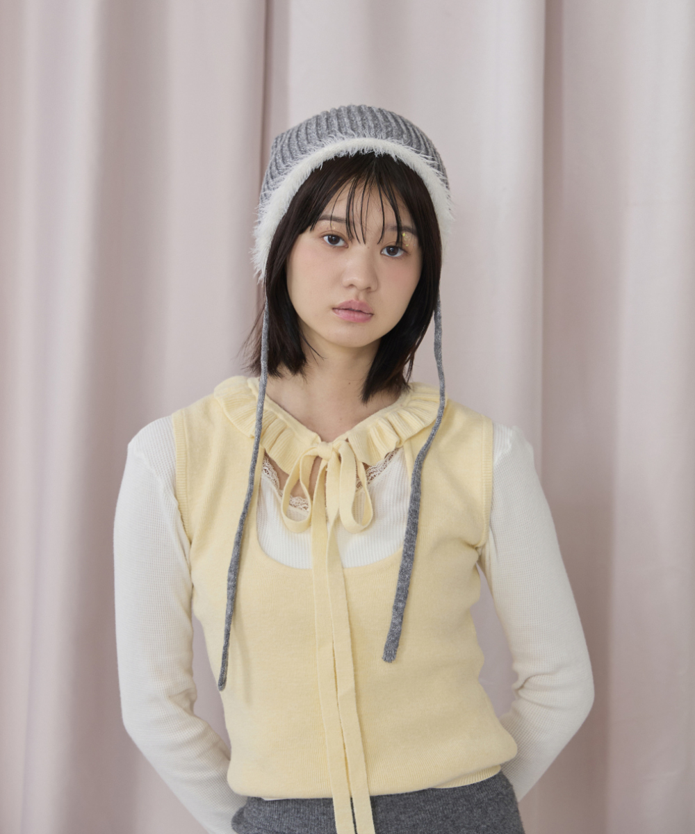 被り口のモケモケとしたフェザーヤーンが、可愛らしさをアップ!