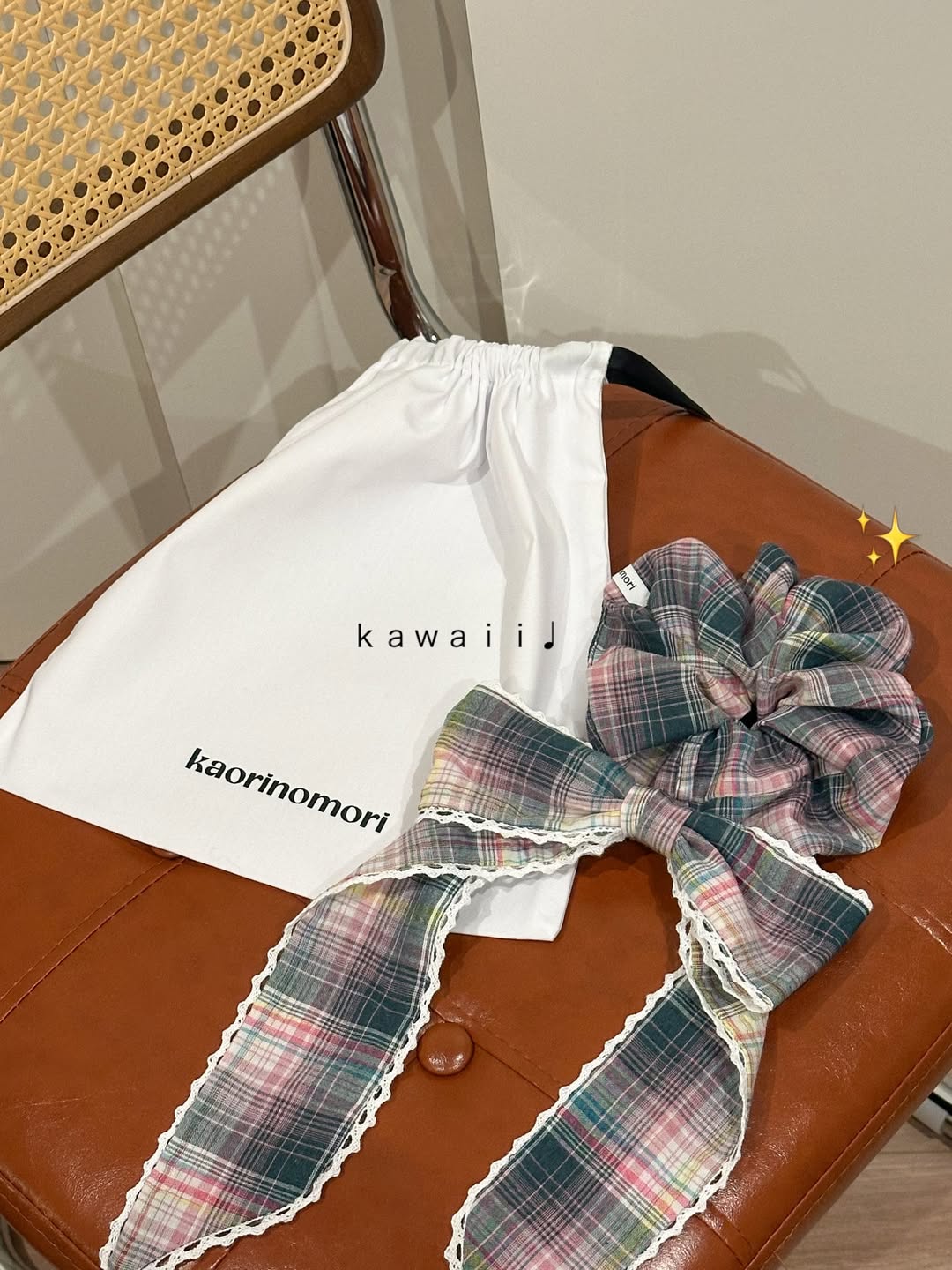 @kaorinomori_official さんのクローブシュシュも水色と黄色のチェック柄で、よーく見たらくまちゃんがいるのがおきにいり。リボンも大きくて可愛い。